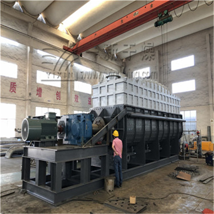 ??干燥機(jī)以蒸汽、熱水或?qū)嵊妥鳛榧訜峤橘|(zhì),軸端裝有熱介質(zhì)導(dǎo)入導(dǎo)出的旋轉(zhuǎn)接頭。加熱介質(zhì)分為兩路,分別進(jìn)入干燥機(jī)殼體夾套和槳葉軸內(nèi)腔,將器身和槳葉軸同時(shí)加熱,以傳導(dǎo)加熱的方式對物料進(jìn)行加熱干燥。被干燥的物料由螺旋送料機(jī)定量地連續(xù)送入干燥機(jī)加料口,物料進(jìn)入槳葉后,通過槳葉的轉(zhuǎn)動使物料翻轉(zhuǎn)、攪拌,不斷改變加熱界面,與器身和槳葉接觸,被充分加熱,使物料所含的表面水分蒸發(fā)。同時(shí),物料隨槳葉軸的旋轉(zhuǎn)成螺旋軌跡向出料口方向輸送,在輸送中繼續(xù)攪拌,使物料中滲出的水分繼續(xù)蒸發(fā)。zui后,干燥均勻的合格產(chǎn)品由出料口排出。