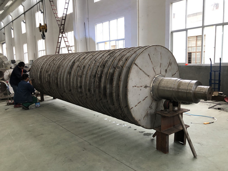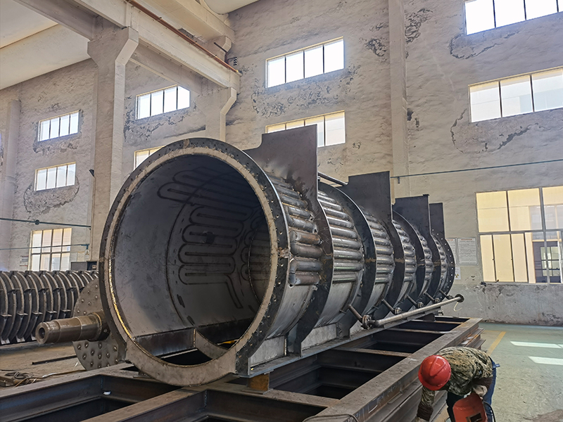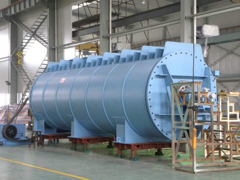 污泥圓盤干燥機(jī)與其他間接干燥設(shè)備相比具有,傳熱面積大,攪拌效果好,更能促進(jìn)水分的蒸發(fā)和去除等優(yōu)點(diǎn),是新開發(fā)的一款改良型簡接加熱干燥機(jī)。轉(zhuǎn)盤式干燥機(jī)主要是由定子(外殼),轉(zhuǎn)子(轉(zhuǎn)盤)和驅(qū)動裝置組成。轉(zhuǎn)子中心軸是干化轉(zhuǎn)盤的承載部件,它是一個中空軸,所有的轉(zhuǎn)盤焊接在這個空軸上。圓盤干燥機(jī)通過轉(zhuǎn)盤邊緣的推進(jìn)/攪拌器的作用,污泥被均勻緩慢地輸送通過整個干燥機(jī),并通過與轉(zhuǎn)盤的熱接觸被干化。